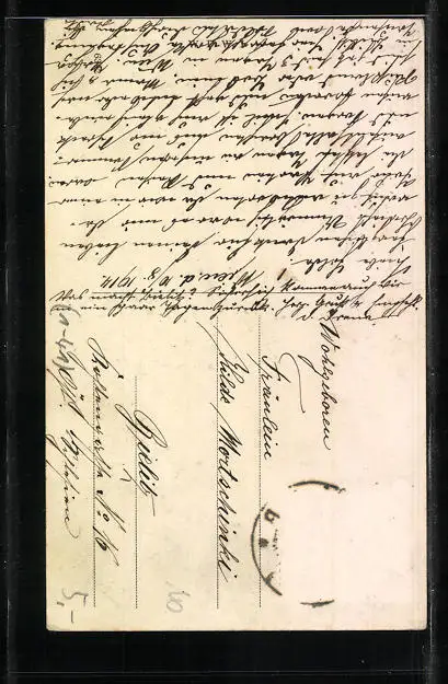 Personenbezogene Daten auf der Rückseite der Karte wurden durch blauen Textmarker unkenntlich gemacht. Die blauen Stellen sind auf die Vorderseite durchgeweicht und wirken sich negativ auf das Postkartenfoto aus