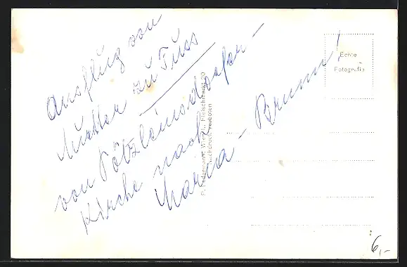 Personenbezogene Daten auf der Rückseite der Karte wurden durch blauen Textmarker unkenntlich gemacht. Die blauen Stellen sind auf die Vorderseite durchgeweicht und wirken sich negativ auf das Postkartenfoto aus