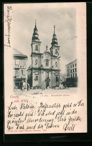 AK Wien, Mariahilfer Kirche mit Denkmal