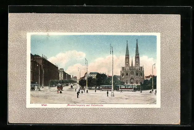 AK Wien, Maximiliansplatz mit Votivkirche und Strassenbahn