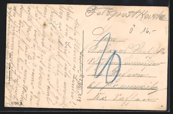 Personenbezogene Daten auf der Rückseite der Karte wurden durch blauen Textmarker unkenntlich gemacht. Die blauen Stellen sind auf die Vorderseite durchgeweicht und wirken sich negativ auf das Postkartenfoto aus