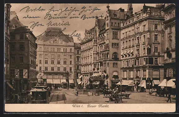 AK Wien, Neuer Markt mit Strassenbahn und Herrnhuter