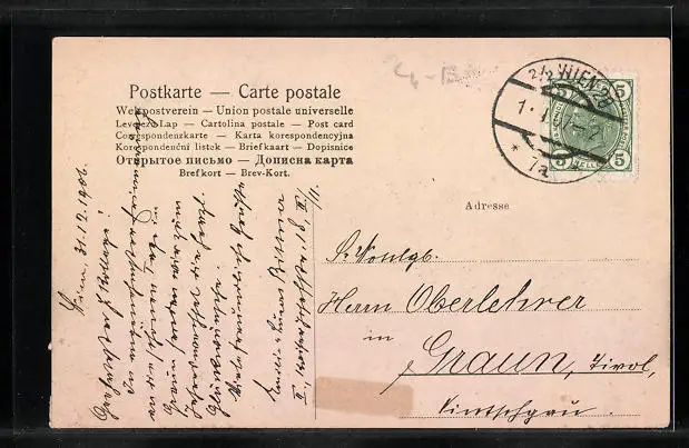 gelaufen 1907, Eckknicke re. oben und unten, guter Zustand