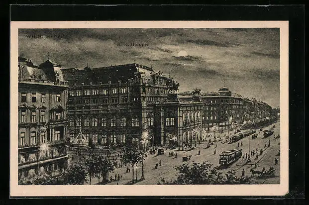 AK Wien, Oper, Strassenpartie in der Dämmerung