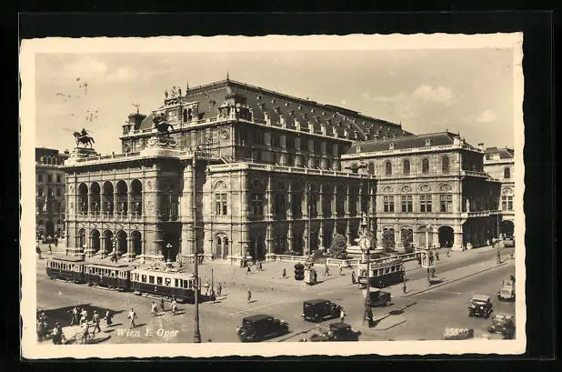 AK Wien, Oper aus der Vogelschau mit Strassenbahnen