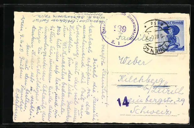 Personenbezogene Daten auf der Rückseite der Karte wurden durch blauen Textmarker unkenntlich gemacht. Die blauen Stellen sind auf die Vorderseite durchgeweicht und wirken sich negativ auf das Postkartenfoto aus
