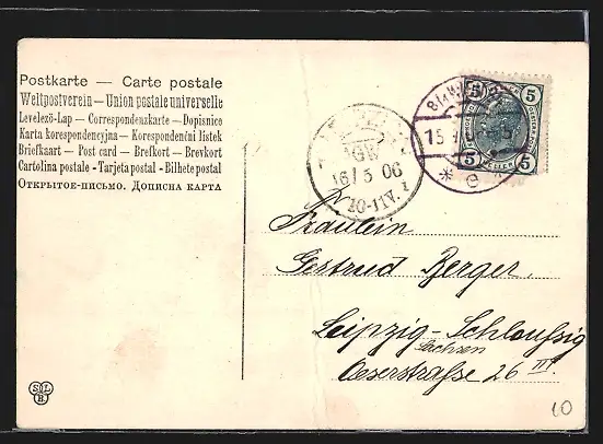 alte Ansichtskarte, gelaufen 1906, Bugspur mittig vertikal, guter Zustand