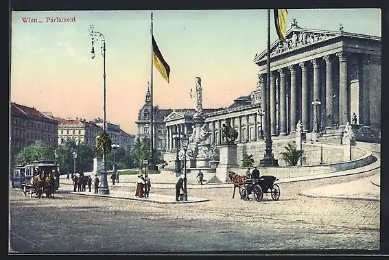 AK Wien, Parlament mit Strassenbahn und Kutsche