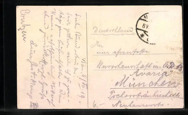 Personenbezogene Daten auf der Rückseite der Karte wurden durch blauen Textmarker unkenntlich gemacht. Die blauen Stellen sind auf die Vorderseite durchgeweicht und wirken sich negativ auf das Postkartenfoto aus