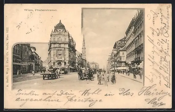 AK Wien, Praterstrasse mit Strassenbahn und Geschäften