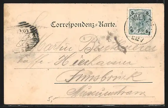 Personenbezogene Daten auf der Rückseite der Karte wurden durch blauen Textmarker unkenntlich gemacht. Die blauen Stellen sind auf die Vorderseite durchgeweicht und wirken sich negativ auf das Postkartenfoto aus