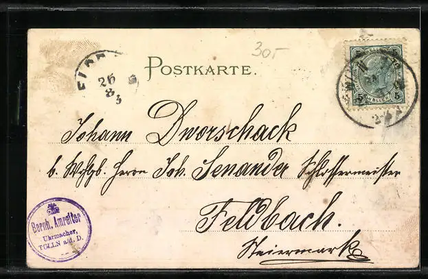 Personenbezogene Daten auf der Rückseite der Karte wurden durch blauen Textmarker unkenntlich gemacht. Die blauen Stellen sind auf die Vorderseite durchgeweicht und wirken sich negativ auf das Postkartenfoto aus