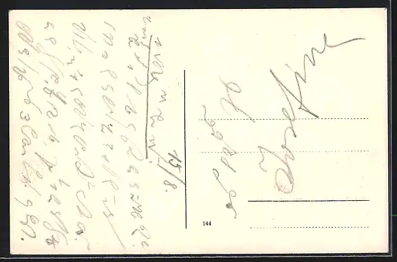 Personenbezogene Daten auf der Rückseite der Karte wurden durch blauen Textmarker unkenntlich gemacht. Die blauen Stellen sind auf die Vorderseite durchgeweicht und wirken sich negativ auf das Postkartenfoto aus