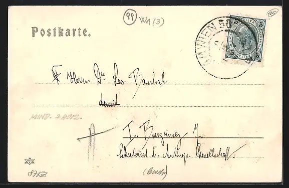 Personenbezogene Daten auf der Rückseite der Karte wurden durch blauen Textmarker unkenntlich gemacht. Die blauen Stellen sind auf die Vorderseite durchgeweicht und wirken sich negativ auf das Postkartenfoto aus