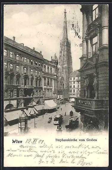 AK Wien, Stephanskirche vom Graben, Pferdebahn