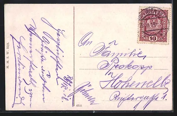 Personenbezogene Daten auf der Rückseite der Karte wurden durch blauen Textmarker unkenntlich gemacht. Die blauen Stellen sind auf die Vorderseite durchgeweicht und wirken sich negativ auf das Postkartenfoto aus