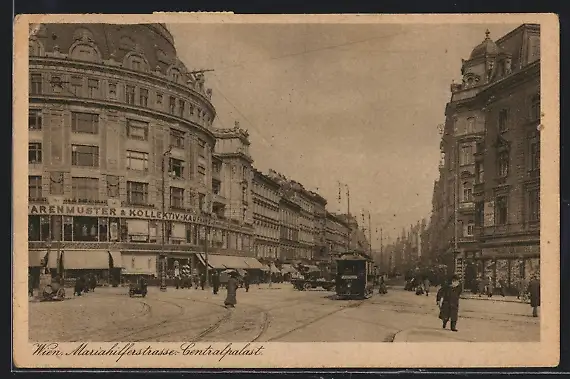 AK Wien, Strassenbahn in der Mariahilferstrasse mit Centralpalast