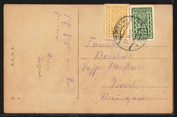 Personenbezogene Daten auf der Rückseite der Karte wurden durch blauen Textmarker unkenntlich gemacht. Die blauen Stellen sind auf die Vorderseite durchgeweicht und wirken sich negativ auf das Postkartenfoto aus