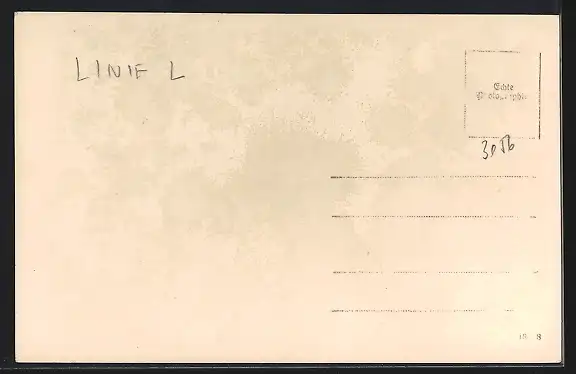 Personenbezogene Daten auf der Rückseite der Karte wurden durch blauen Textmarker unkenntlich gemacht. Die blauen Stellen sind auf die Vorderseite durchgeweicht und wirken sich negativ auf das Postkartenfoto aus