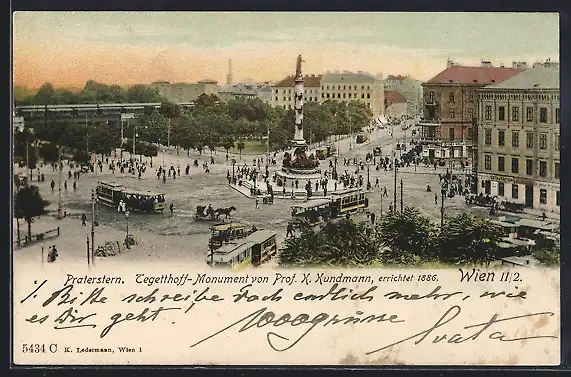 AK Wien, Strassenbahnen umfahren das Tefetthoff-Monument