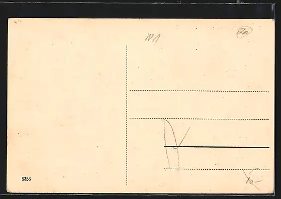 Personenbezogene Daten auf der Rückseite der Karte wurden durch blauen Textmarker unkenntlich gemacht. Die blauen Stellen sind auf die Vorderseite durchgeweicht und wirken sich negativ auf das Postkartenfoto aus