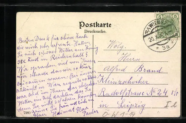 Personenbezogene Daten auf der Rückseite der Karte wurden durch blauen Textmarker unkenntlich gemacht. Die blauen Stellen sind auf die Vorderseite durchgeweicht und wirken sich negativ auf das Postkartenfoto aus