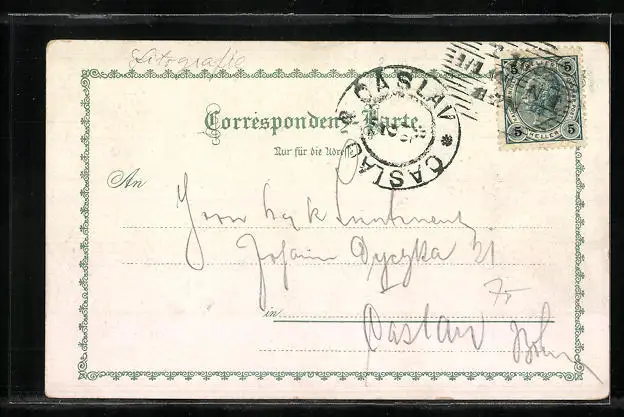 Personenbezogene Daten auf der Rückseite der Karte wurden durch blauen Textmarker unkenntlich gemacht. Die blauen Stellen sind auf die Vorderseite durchgeweicht und wirken sich negativ auf das Postkartenfoto aus