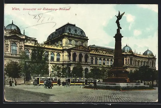 AK Wien, Universität, Liebenberg-Denkmal und Strassenbahn