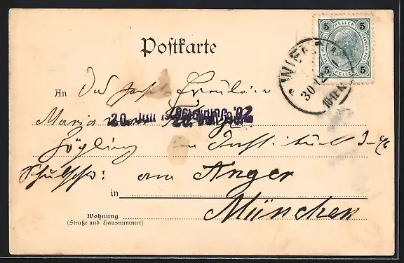 Personenbezogene Daten auf der Rückseite der Karte wurden durch blauen Textmarker unkenntlich gemacht. Die blauen Stellen sind auf die Vorderseite durchgeweicht und wirken sich negativ auf das Postkartenfoto aus