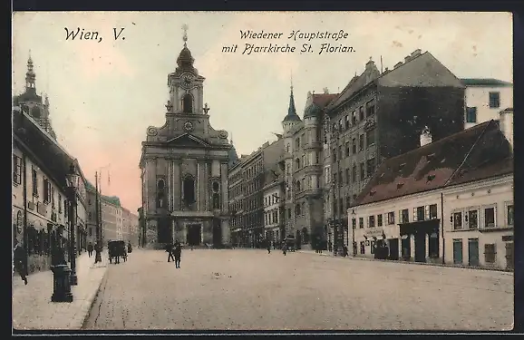 AK Wien, Wiedener Hauptstrasse mit Pfarrkirche St. Florian