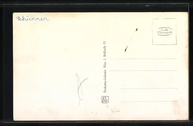 Personenbezogene Daten auf der Rückseite der Karte wurden durch blauen Textmarker unkenntlich gemacht. Die blauen Stellen sind auf die Vorderseite durchgeweicht und wirken sich negativ auf das Postkartenfoto aus