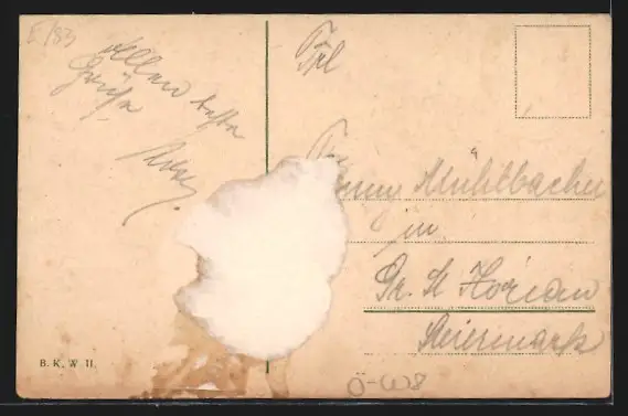 Personenbezogene Daten auf der Rückseite der Karte wurden durch blauen Textmarker unkenntlich gemacht. Die blauen Stellen sind auf die Vorderseite durchgeweicht und wirken sich negativ auf das Postkartenfoto aus