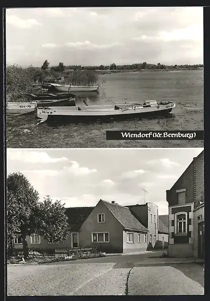 AK Wiendorf / Bernburg, Strassenpartie, Boote am Seeufer