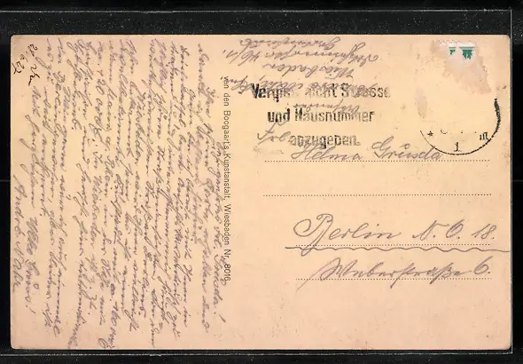 Personenbezogene Daten auf der Rückseite der Karte wurden durch blauen Textmarker unkenntlich gemacht. Die blauen Stellen sind auf die Vorderseite durchgeweicht und wirken sich negativ auf das Postkartenfoto aus