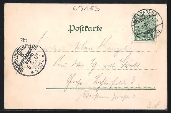 gelaufen 1901, Eckknick oben li., guter Zustand