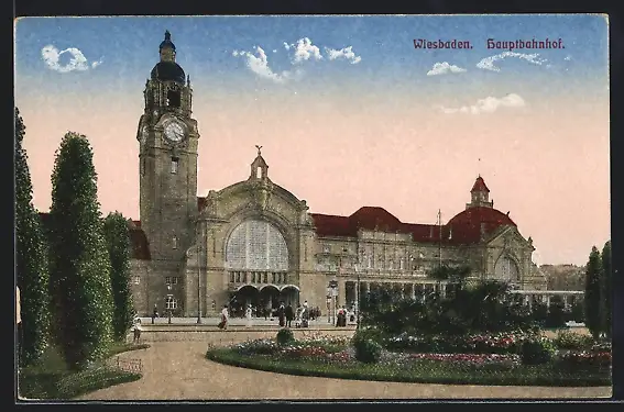 AK Wiesbaden, Hauptbahnhof mit Gartenanlagen
