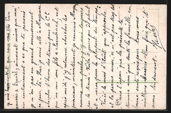 Personenbezogene Daten auf der Rückseite der Karte wurden durch blauen Textmarker unkenntlich gemacht. Die blauen Stellen sind auf die Vorderseite durchgeweicht und wirken sich negativ auf das Postkartenfoto aus