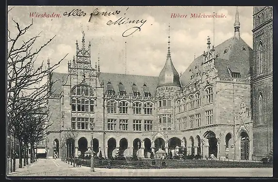 AK Wiesbaden, Höhere Mädchenschule mit Strasse u. Vorgarten