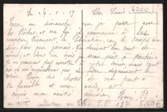 Personenbezogene Daten auf der Rückseite der Karte wurden durch blauen Textmarker unkenntlich gemacht. Die blauen Stellen sind auf die Vorderseite durchgeweicht und wirken sich negativ auf das Postkartenfoto aus