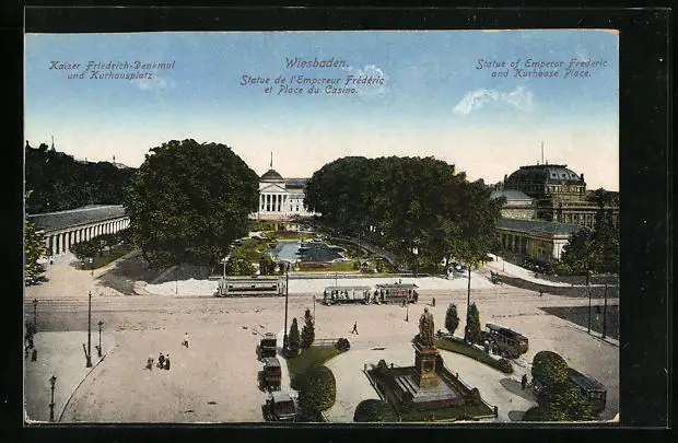 AK Wiesbaden, Kaiser Friedrich-Denkmal und Kurhausplatz mit Strassenbahn