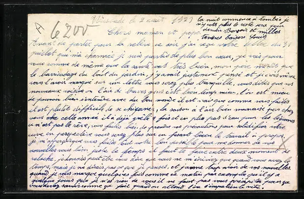 Personenbezogene Daten auf der Rückseite der Karte wurden durch blauen Textmarker unkenntlich gemacht. Die blauen Stellen sind auf die Vorderseite durchgeweicht und wirken sich negativ auf das Postkartenfoto aus