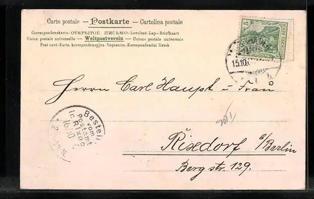 Personenbezogene Daten auf der Rückseite der Karte wurden durch blauen Textmarker unkenntlich gemacht. Die blauen Stellen sind auf die Vorderseite durchgeweicht und wirken sich negativ auf das Postkartenfoto aus