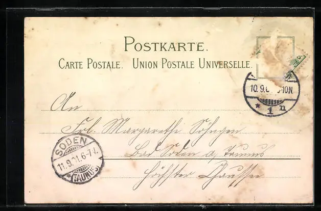 alte Ansichtskarte, gelaufen, Briefmarke tw. entfernt, rückseitig Oberflächenschaden, guter Zustand