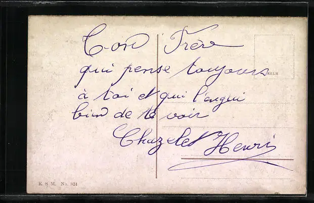 Personenbezogene Daten auf der Rückseite der Karte wurden durch blauen Textmarker unkenntlich gemacht. Die blauen Stellen sind auf die Vorderseite durchgeweicht und wirken sich negativ auf das Postkartenfoto aus