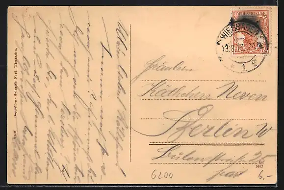 Personenbezogene Daten auf der Rückseite der Karte wurden durch blauen Textmarker unkenntlich gemacht. Die blauen Stellen sind auf die Vorderseite durchgeweicht und wirken sich negativ auf das Postkartenfoto aus