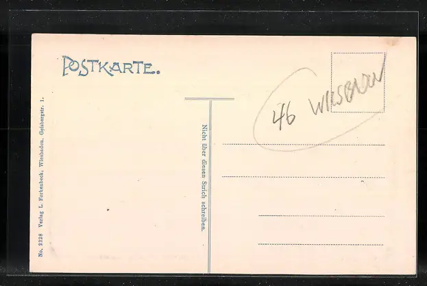 Personenbezogene Daten auf der Rückseite der Karte wurden durch blauen Textmarker unkenntlich gemacht. Die blauen Stellen sind auf die Vorderseite durchgeweicht und wirken sich negativ auf das Postkartenfoto aus