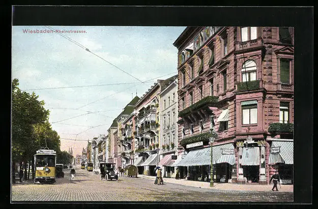 AK Wiesbaden, Partie in der Rheinstrasse mit Strassenbahnen