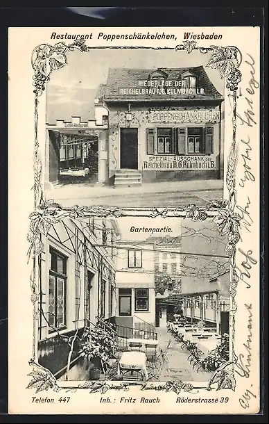 AK Wiesbaden, Restaurant Poppenschänkelchen mit Gartenpartie, Röderstrasse 39