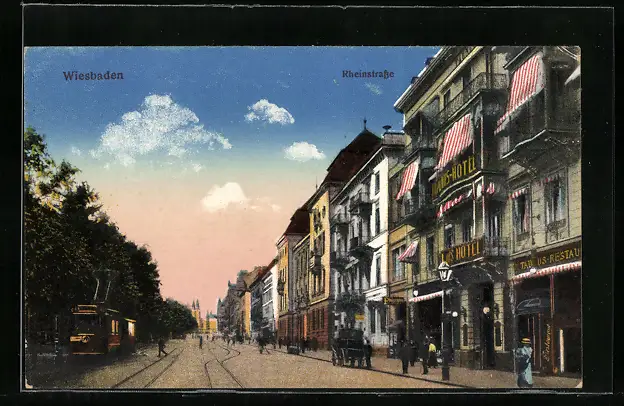 AK Wiesbaden, Strassenbahn in der Rheinstrasse