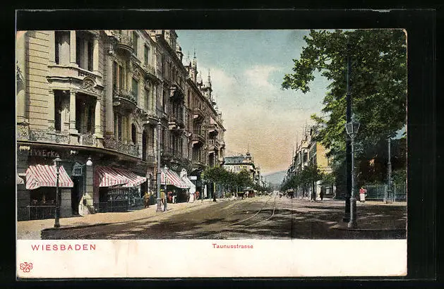 AK Wiesbaden, Taunusstrasse mit Passanten und Pferdebahn
